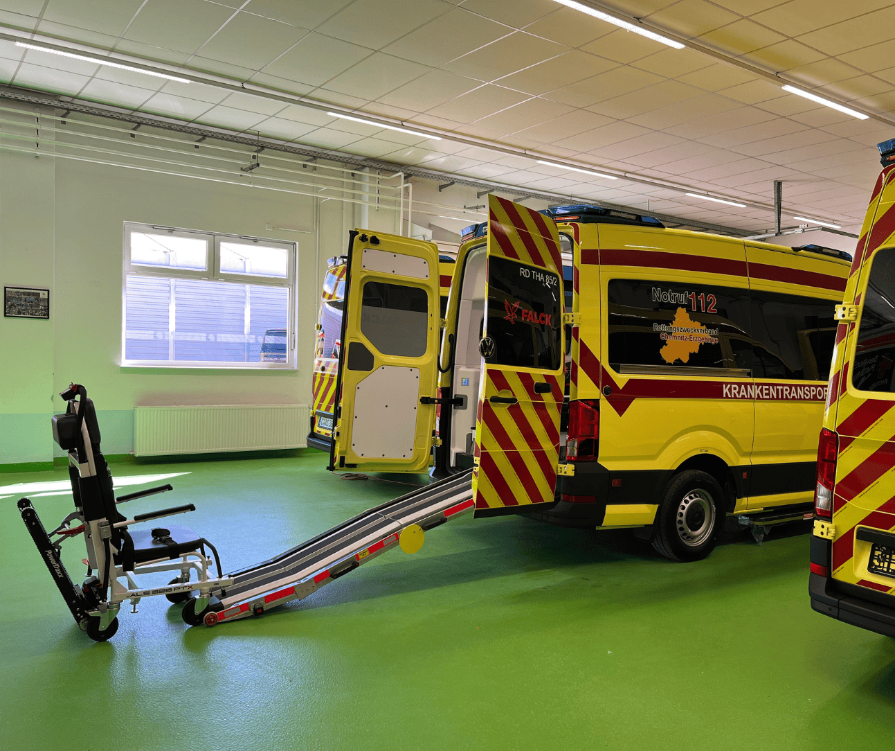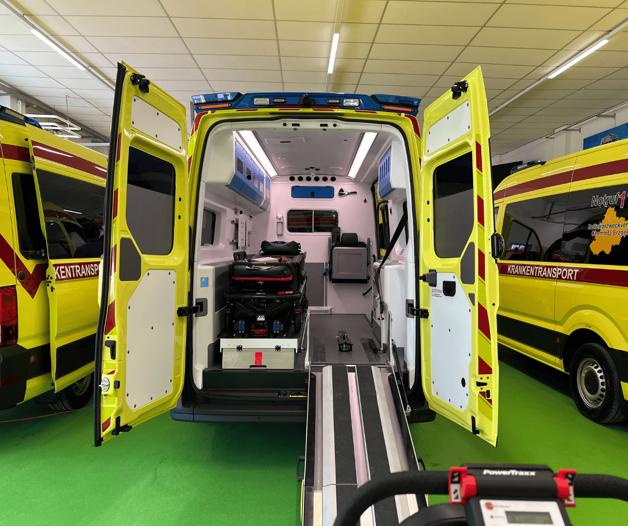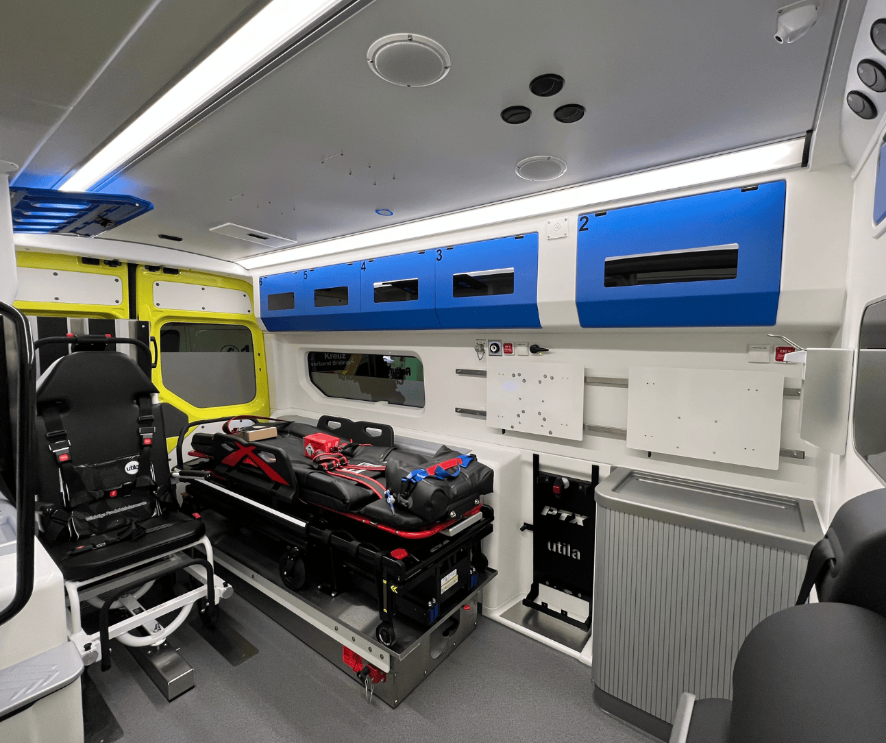 Die KTW sind mit einer hochwertigen Ausstattung gemäß EN 1789:2020 versehen und verfügen über einen durchdachten Innenausbau, einschließlich der Tragenlagerung TL-2022 für das FERNO VIPER Tragensystem sowie die Auffahrrampe KR24 für Tragestühle mit Raupenantrieb, wodurch sie bestens für die unterschiedlichen Herausforderungen im Rettungsdienst gerüstet sind.