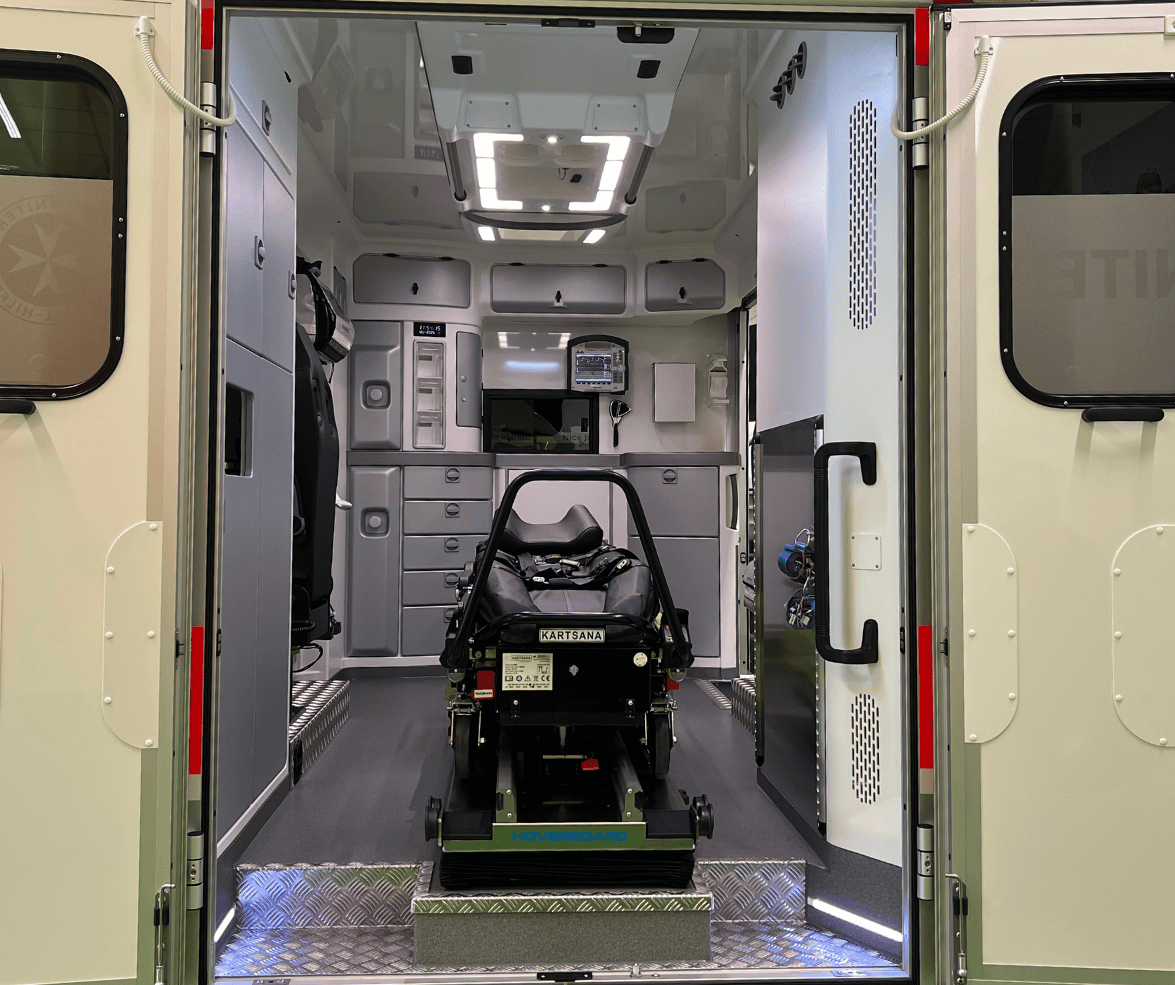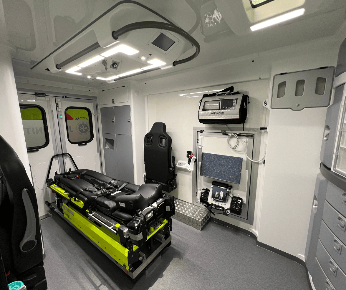 Neben dem Trennwandschrank aus robustem ABS-Kunststoff ist der TIGIS N20 mit einem Dachfenster und dem modernen Kartsana powerBRAVA Tragensystem auf der luftgefederten Hoverboard BravoBase ausgestattet, welche in diesem Ausbau ein sicheres und komfortables Handling für Patienten und Rettungsdienstpersonal gewährleistet.