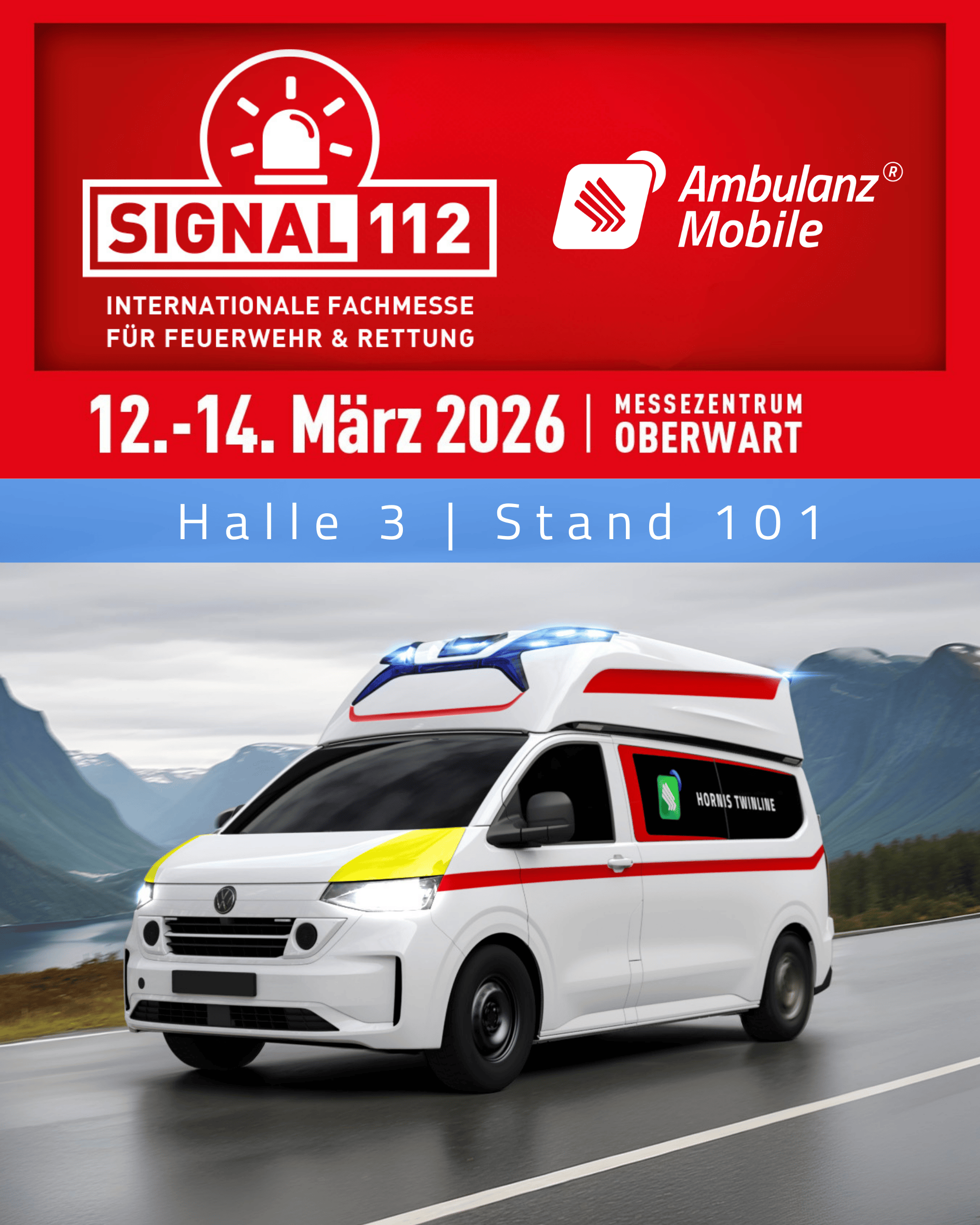 Vom 12. bis 14. März präsentieren wir uns auf der Signal112, der internationalen Messe für Feuerwehr und Rettung in Oberwart. Dort stellen wir zwei unserer Krankentransportwagen-Konzepte vor: den kompaktgebauten Twinline sowie den vielseitig einsetzbaren Valeris V21.