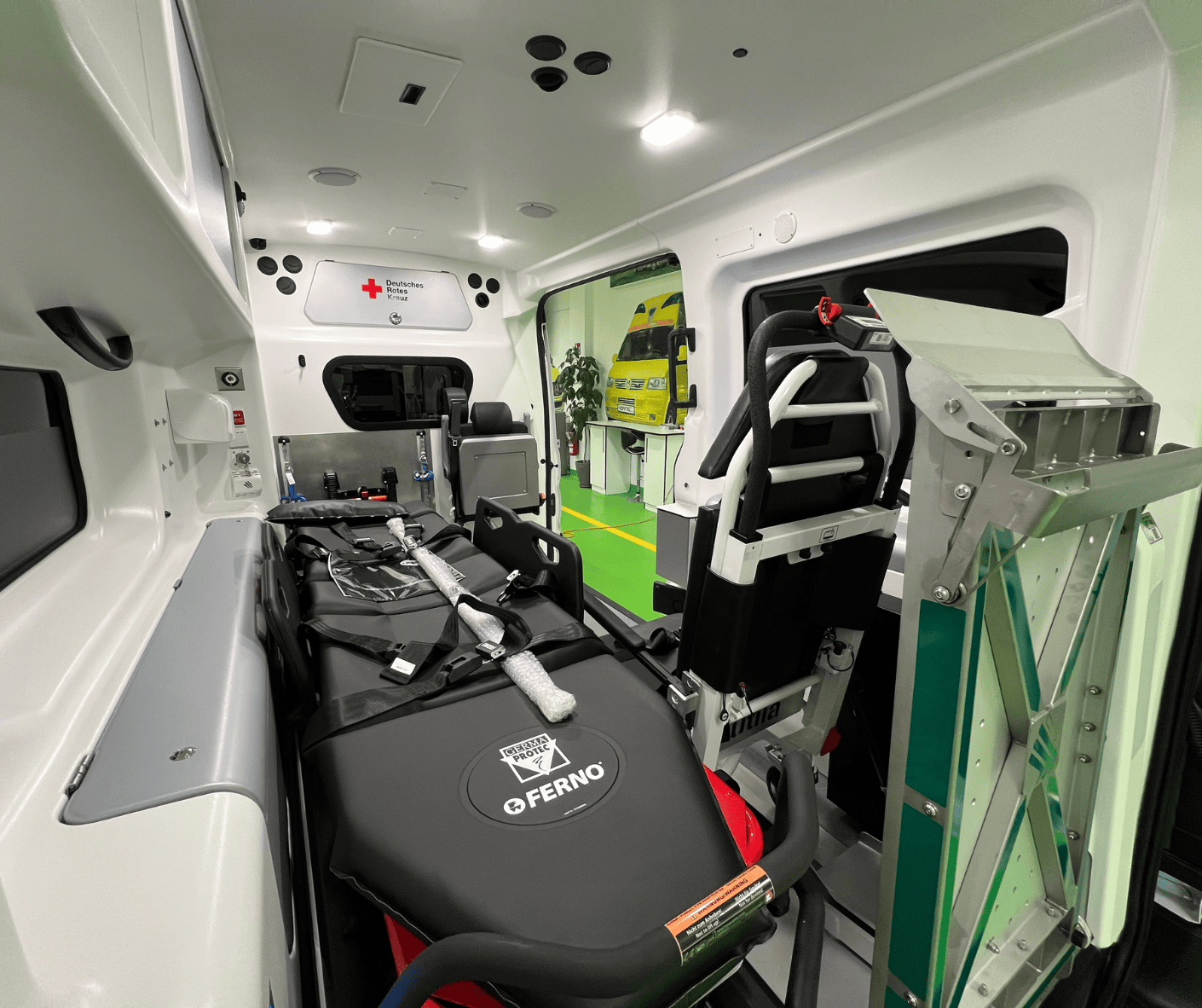 Die Fahrzeuge verfügen über ein großzügiges Platzangebot mit passgenauem Innenausbau und sind gemäß EN 1789:2020 ausgestattet. Dazu gehören unter anderem eine Tragenlagerung für die Patiententrage Ferno Viper sowie ein elektrohydraulischer Tragestuhllift TSL-200 mit Tastenmodul an der rechten Hecktür.